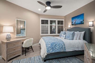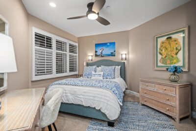 Bedroom 2, also en suite bath, has a queen size bed and is located near the entry of the unit.