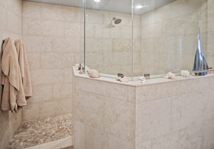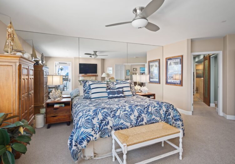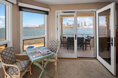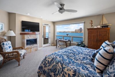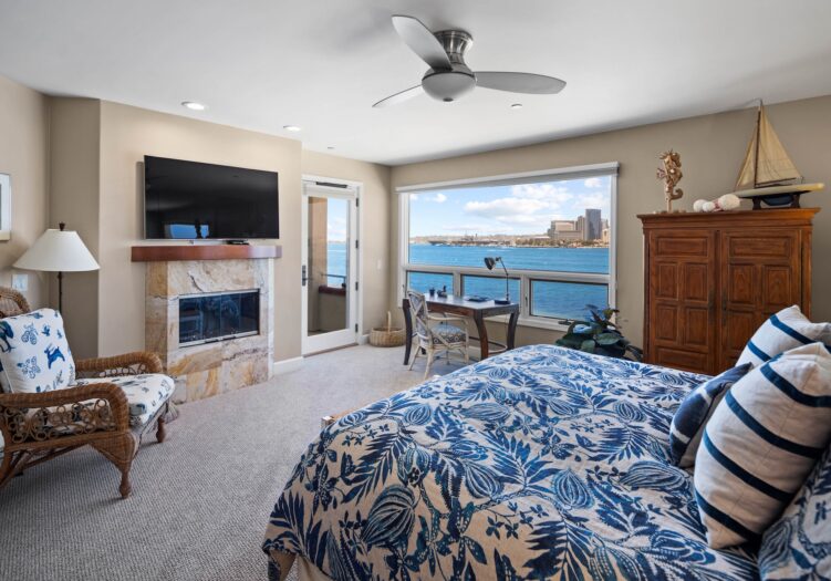 The primary bedroom with king-size bed is complete with en suite bathroom and is located in the front of the unit facing the water and has unobstructed views of the bay and skyline. There's also a French door leading out to a sitting deck that allows for morning coffee or a glass of wine at sunset.